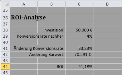 Im Zahlenbeispiel hat sich die Einführung und Nutzung von Google Analytics gelohnt, wenn Sie dieser Marketing-Investition eine hinreichend große Erhöhung der Konversionsrate zurechnen können. Eine Sensitivitätsanalyse kann hier Klarheit verschaffen.